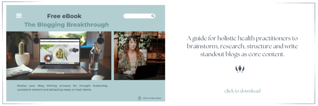 Interested in writing thoughtful, informative blogs over short social media content that will get people to your website to book you, but you aren’t sure where to start? Download The Blogging Breakthrough: A guide for holistic health practitioners to brainstorm, research, structure, and write standout blogs as core content.